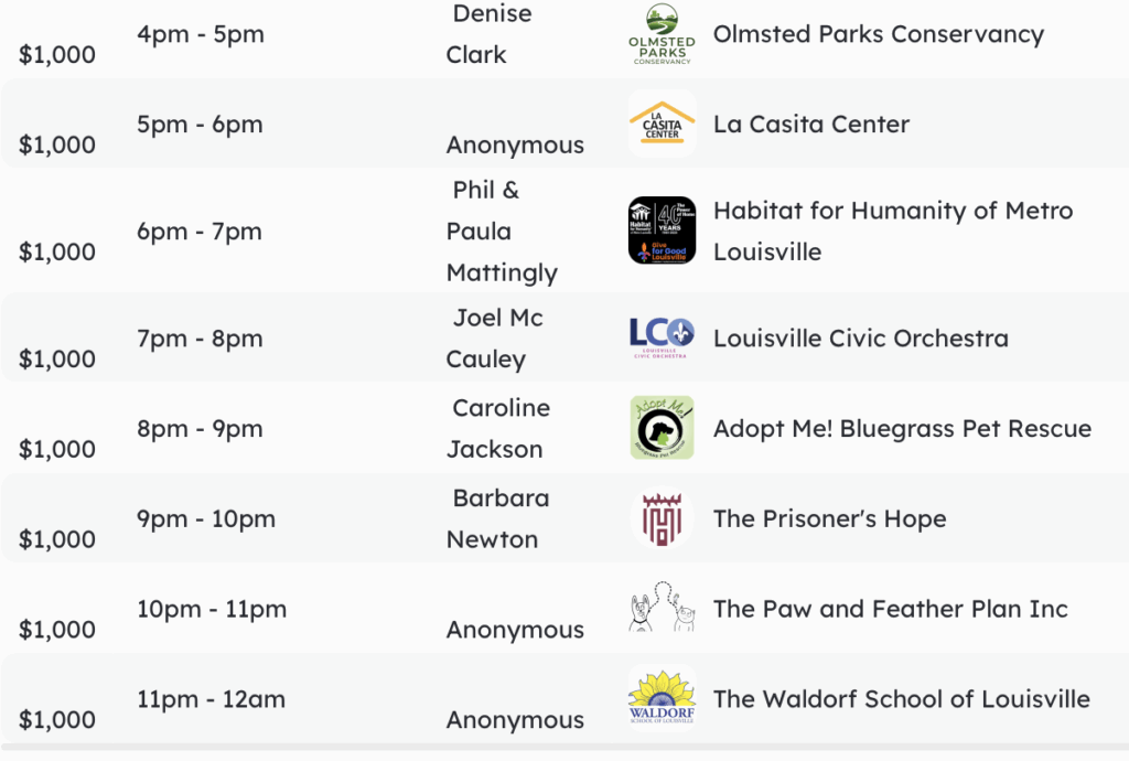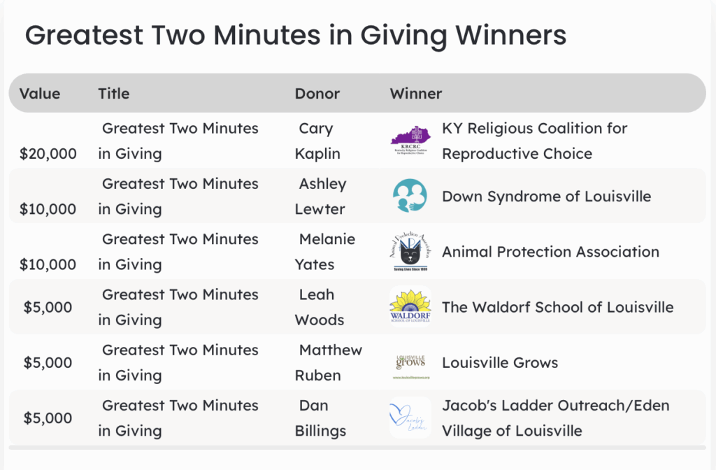 The “Greatest Two Minutes in Giving” sponsored by Churchill Downs returned for its fourth year. Six donors were chosen at random to receive a “Win”, “Place”, or “Show” prize of $20,000, $10,000, or $5,000 to boost their donations during the giving day.
