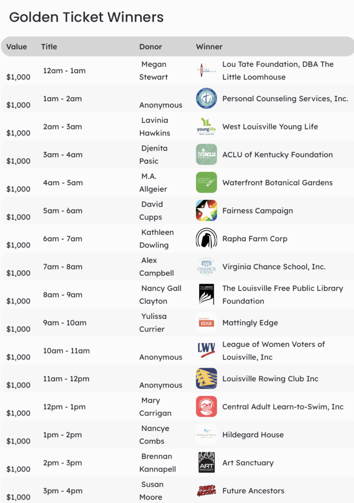 During every hour of Give for Good Louisville, a lucky donation was randomly selected to receive a $1,000 Derby City Gaming Golden Ticket.