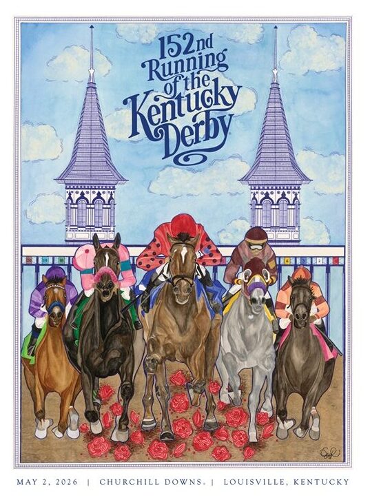 Reynolds’ official Derby 152 artwork showcases five Thoroughbreds charging from the starting gate beneath the Twin Spires, with red roses bursting from the track to demonstrate the emotion and anticipation of the Run for the Roses®.