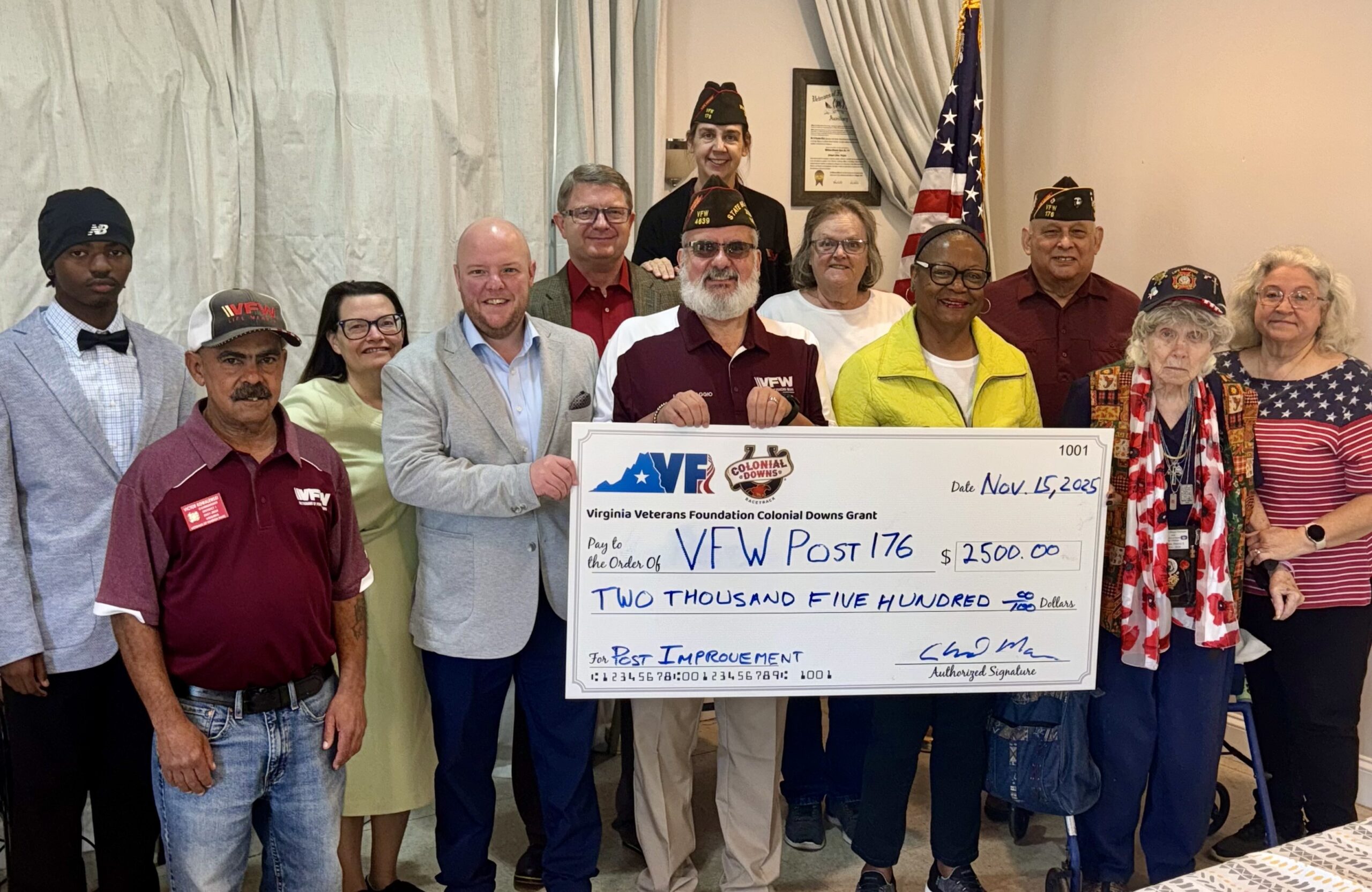 Today, Churchill Downs Incorporated and the Virginia Veterans Foundation announced a charitable contribution of $2,500 to VFW Post 776 (Radford-Montgomery) to help the Post recover from a recent break-in and act of vandalism that significantly damaged its facility.