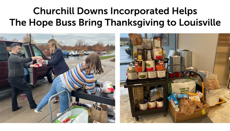 On Thursday, November 20, Churchill Downs Incorporated (CDI) employees came together for a Thanksgiving food drive to “Fill the Buss,” benefitting The Hope Buss. Team members donated food and meal prep essentials—cranberry sauce, mashed potatoes, stuffing, green beans, pans and more—to help provide a warm holiday meal for those in need. These contributions will support The Hope Buss in serving a Thanksgiving celebration to families across the community.