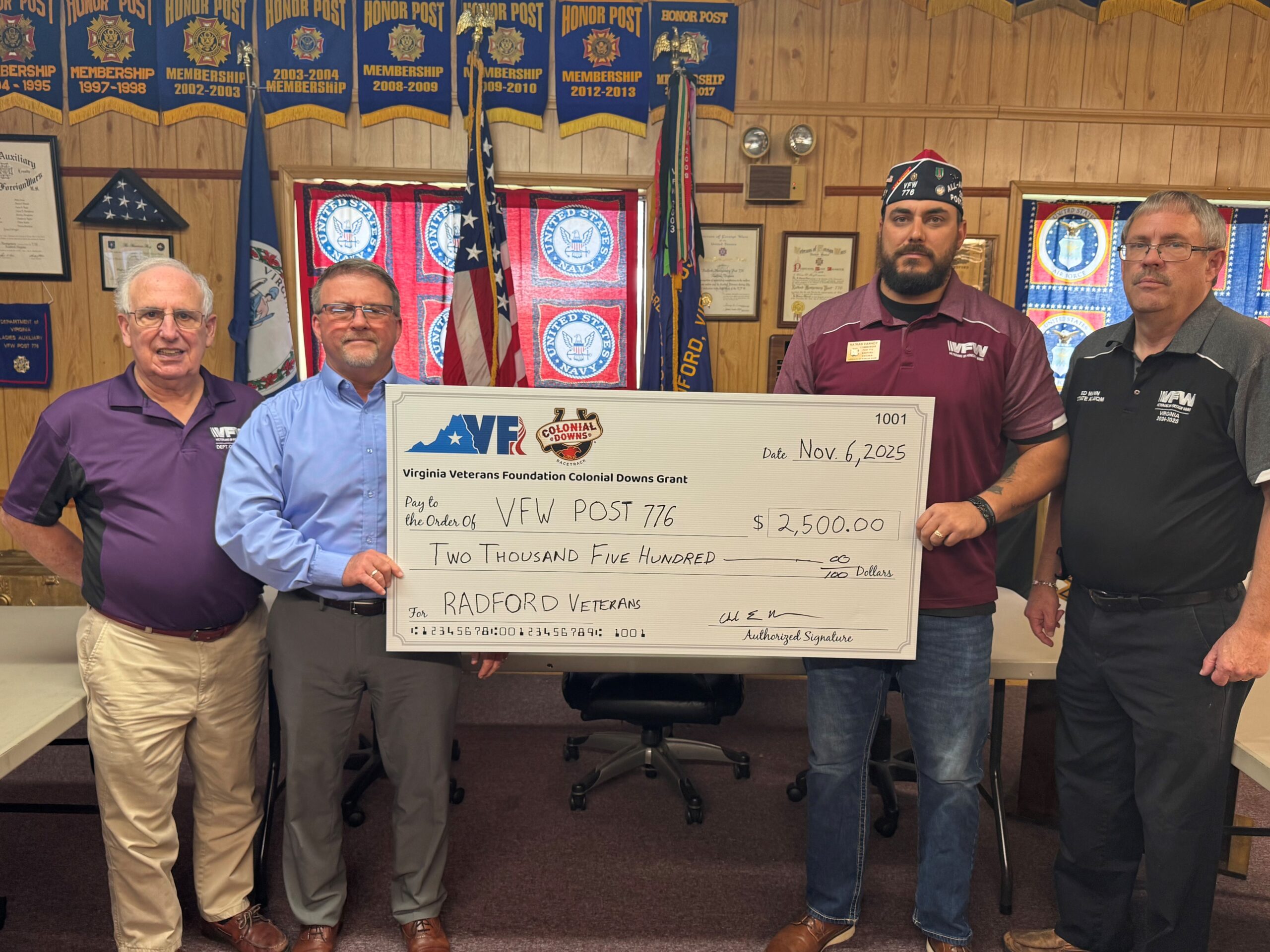 Today, Churchill Downs Incorporated and the Virginia Veterans Foundation announced a charitable contribution of $2,500 to VFW Post 776 (Radford-Montgomery) to help the Post recover from a recent break-in and act of vandalism that significantly damaged its facility.